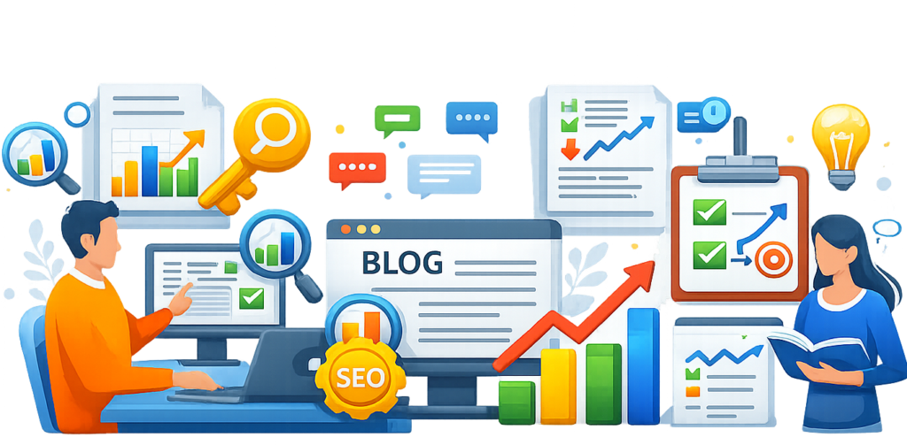 Content strategy is the process of planning, creating, and managing content that aligns with your business goals and audience needs. Blog optimization focuses on improving existing and new blog posts so they perform better in search engines.